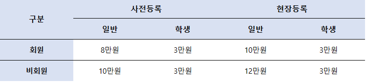 ◎ 기업부스 참여- 회 원 사 : 66만원 (VAT포함) - 비회원사: 110만원 (VAT포함) - 부스 구성 : 데스크 1, 의자 2개 및 소형 현수막 제공(데스크 걸이용) - 단체회원 가입 + 부스 신청 동시 진행 시에 S등급사 기준 400만원으로 금액 다운하여 제공 (※상세문의는 사무국으로 연락주십시오.)
