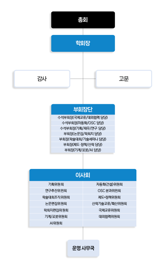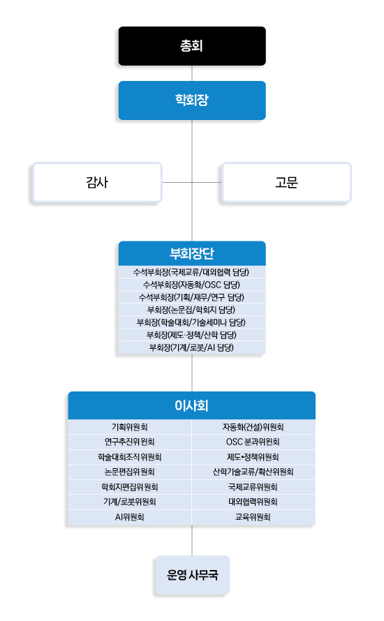 - 기획 및 장기적 발전 방안에 대한 사항 담당 - 회칙의 제정 및 개정에 관한 사항 담당 - 기술·제도의 개선에 관한 사항 담당 - 정부 부처간 건설자동화 및 로보틱스 관련 과제 협업 지원 |